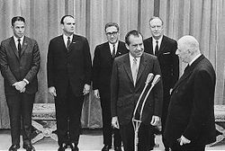 وليام روجرز في الصف الأول (يمين) من طاقم فريق الرئيس نيكسون الذي يتحدث إلى شارل ديگول في مارس 1969.