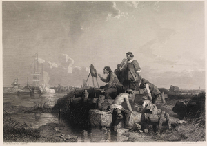 He was the official artist of the Dutch fleet for a period, being present at the Four Days Battle, 1–4 June 1666, and the St James's Day Battle, 25 July 1666, to make sketches. In his work on the biographies of artists, Arnold Houbraken quotes Gerard Brandt's biography of Admiral Michiel de Ruyter,[1] relating the anecdote where Willem van de Velde asked Admiral de Ruyter permission to have a galley row him around for a good view of the proceedings on the evening of the Four Days battle in 1666. He wasn't the only artist to paint the scenes of this battle, his son, Ludolf Bakhuysen and Pieter Cornelisz van Soest also made paintings of it. This act later was the reason that van Velde gained his marine commission in London. The date, 1672, commonly given for his entry into the service of Charles II of England, was at a time when the Dutch Republic was at war with England (Third Anglo-Dutch War).