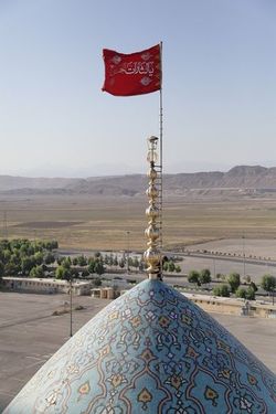 | رفع راية حمراء مكتوب عليها "يالثارات الحسين" فوق قبة مسجد جمكران، بمدينة قم، 5 يناير 2020. |