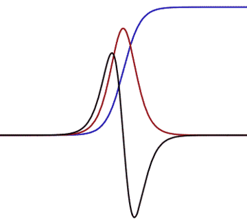 Schematic diagram with cumulative production of a finite resource in blue, yearly production in red and growth rate in black