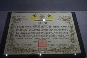 Puyi believed Manchukuo was just the beginning, and that within a few years he would again reign as Emperor of China, having the yellow imperial dragon robes used for coronation of Qing emperors brought from Beijing to Changchun.[104] At the time, Japanese propaganda depicted the birth of Manchukuo as a triumph of Pan-Asianism, with the "five races" of Japanese, Chinese, Koreans, Manchus, and Mongols coming together, which marked nothing less than the birth of a new civilization and a turning point in world history. A press statement issued on 1 March 1932 stated: "The glorious advent of Manchukuo with the eyes of the world turned on it was an epochal event of far-reaching consequence in world history, marking the birth of a new era in government, racial relations, and other affairs of general interest. Never in the chronicles of the human race was any State born with such high ideals, and never has any State accomplished so much in such a brief space of its existence as Manchukuo".[105]