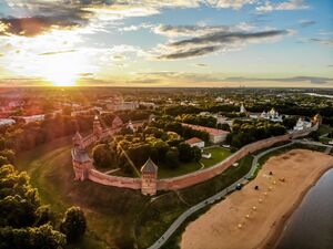 The Varangian name of the city Holmgård or Holmgard (Holmgarðr or Holmgarðir) is mentioned in Norse Sagas as existing at a yet earlier stage, but the correlation of this reference with the actual city is uncertain.[11] Originally, Holmgård referred to the stronghold, now only 2 km (1.2 ميل) to the south of the center of the present-day city, Rurikovo Gorodische (named in comparatively modern times after the Varangian chieftain Rurik, who supposedly made it his "capital" around 860). Archaeological data suggests that the Gorodishche, the residence of the Knyaz (prince), dates from the mid-9th century,[12] whereas the town itself dates only from the end of the 10th century; hence the name Novgorod, "new city", from Old East Slavic Новъ and Городъ (Nov and Gorod); the Old Norse term Nýgarðr is a calque of an Old Russian word. First mention of this Norse etymology to the name of the city of Novgorod (and that of other cities within the territory of the then Kievan Rus') occurs in the 10th-century policy manual De Administrando Imperio by Byzantine emperor Constantine VII.[بحاجة لمصدر]