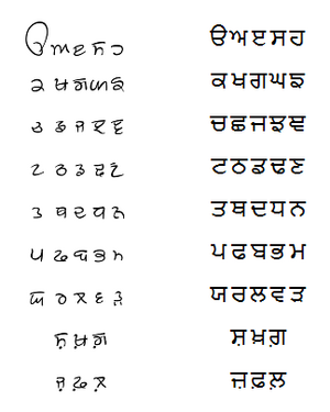 - ^ أ ب ت ث ج ح خ د ذ ر ز س ش ص ض ط ظ ع غ ف ق ك ل م ن هـ و ي Harjeet Singh Gill (1996). "The Gurmukhi Script". In Peter T. Daniels; William Bright (eds.). The World's Writing Systems. Oxford University Press. pp. 395–399. ISBN 978-0-19-507993-7.