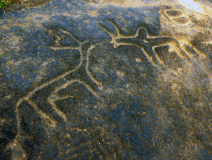 Rock art engravings found in Goa are one of the earliest known traces of human life in India.[16] Goa, situated within the Shimoga-Goa Greenstone Belt in the Western Ghats (an area composed of metavolcanics, iron formations and ferruginous quartzite), yields evidence for Acheulean occupation.[17] Rock art engravings (petroglyphs) are present on laterite platforms and granite boulders in Usgalimal near the west flowing Kushavati river and in Kajur.[18] In Kajur, the rock engravings of animals, tectiforms and other designs in granite have been associated with what is considered to be a megalithic stone circle with a round granite stone in the centre.[19] Petroglyphs, cones, stone-axe, and choppers dating to 10,000 years ago have been found in various locations in Goa, including Kazur, Mauxim, and the Mandovi-Zuari basin.[20] Recently these petroglyphs have been included in the tentative list of UNESCO world heritage sites.