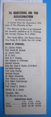 بعد اغتيال جون ف. كندي بقليل، نشر برتراند رسل مقالة رافضة لمجرى التحقيق بعنوان “16 Questions on the Assassination” في عدد سبتمبر 1964 من دورية The Minority of One التي كان يصدرها M.S. Arnoni.