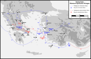 - With the increasingly real threat to his Empire from the Romans, أنطيوخس الثالث is eager to negotiate on the basis of Rome's previous demands, but the Romans insist that he first give up the region west of the Taurus Mountains. When Antiochus refuses, the Battle of Magnesia is fought near Magnesia ad Sipylum, on the plains of Lydia in الأناضول, between the Romans, led by the consul Lucius Cornelius Scipio and his brother, Scipio Africanus, with their ally Eumenes II of Pergamum, and the army of Antiochus III the Great of the Seleucid Empire. The resulting decisive Roman victory ends the conflict with the Seleucids for the control of Greece.