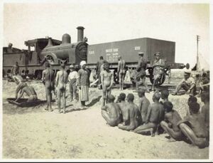 عمال السكة الحيديد بقرب من عربة الماء في خط مصر -فلسطين عام 1916.