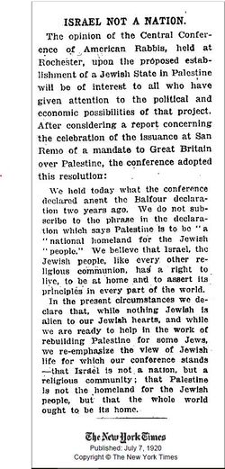 المجلس المركزي لحاخامات أمريكا يعارض ذِكر وعد بلفور أن فلسطين ستكون وطن قومي لليهود. النيويورك تايمز، 5 ثم 7 يوليو 1918.