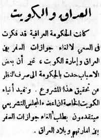 - عام ١٩٣٨، أعضاء المجلس التشريعي قدموا مشروع بطلب إلغاء الجوازات بين الكويت والعراق، جريدة الدفاع العراقية.