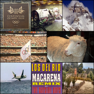 From left, clockwise: A bomb explodes at Centennial Olympic Park in Atlanta, set off by a radical anti-abortionist; The center fuel tank explodes on TWA Flight 800, causing the plane to crash and killing everyone on board; Eight people die in a blizzard on Mount Everest; Dolly the Sheep becomes the first mammal to have been cloned from an adult somatic cell; The Port Arthur Massacre occurs on Tasmania, and leads to major changes in Australia's gun laws; Macarena, sung by Los del Río and remixed by The Bayside Boys, becomes a major dance craze and cultural phenomenon; Ethiopian Airlines Flight 961 crash-ditches off of the Comoros Islands after the plane was hijacked; the 1996 Summer Olympics are held in Atlanta, marking the Centennial (100th Anniversary) of the modern Olympic Games.
