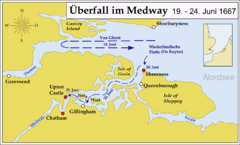 - 1667 - أثناء الحرب الإنگليزية الهولندية الثانية، المستعرة منذ 1665، بدأ الأسطول الهولندي، وحتى 24 يونيو هجوماً متواصلاً على مدواي. فبقيادة الأميرال ميشيل ده رويتر، توغلوا في مصب نهر التيمس حتى وصلوا نهر مدواي وهاجموا البحرية الملكية في إنگلترة مباشرة.