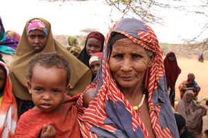 Occurring between July 2011 and mid-2012, a severe drought affected the entire East African region.[7] Said to be "the worst in 60 years",[8] the drought caused a severe food crisis across Somalia, Djibouti, Ethiopia and Kenya that threatened the livelihood of 9.5 million people.[6] Many refugees from southern Somalia fled to neighboring Kenya and Ethiopia, where crowded, unsanitary conditions together with severe malnutrition led to a large number of deaths.[9] Other countries in East Africa, including Sudan, South Sudan and parts of Uganda, were also affected by a food crisis.[8][10][11][12]