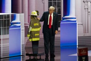 دونالد ترمپ يقف بجانب زي رجال الإطفاء الخاص بكوري كوپبرستور، الذي أصيب بجروح قاتلة برصاصة أثناء محاولة اغتيال ترمپ. يلقي ترمپ خطاب قبوله في المؤتمر الوطني الجمهوري 2024.