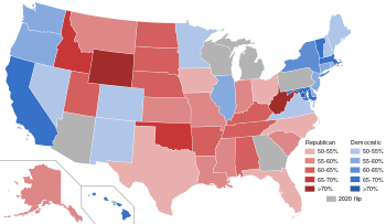 التوجه الحزبي المتوقع للولايات الأمريكية الخمسين ومقاطعة كولومبيا على المستوى الرئاسي. يشير تظليل كل ولاية إلى حصة الفائز في أصوات الحزبين، والتي أُدرج متوسطها بين الانتخابات الرئاسية لعامي 2016 و2020. الولايات التي انقلبت عام 2020 ملونة باللون الرمادي.