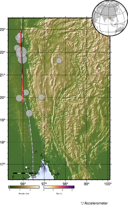 It is the largest earthquake with an epicenter in Myanmar since the 1912 Maymyo earthquake (which had an Mw of 7.9).[21] The focal mechanism solution indicated it occurred due to strike-slip faulting at a depth of 10 km (6.2 mi). The type of faulting is consistent with rupture on the Sagaing Fault. According to a finite fault model released by the USGS, the earthquake rupture extended about 350 km (220 mi) by 10 km (6.2 mi) from Thabeikkyin in Mandalay to Naypyidaw; 100 km (62 mi) of the fault ruptured to the north of the epicenter while 250 km (160 mi) of rupture occurred to the south. Most of the slip which exceeded 1 m (3 ft 3 in) was concentrated between Thabeikkyin and Yamethin, north of Naypyidaw. A maximum slip of 6.48 m (21.3 ft) was recorded north of the hypocenter, between Singu and Madaya. However, the ShakeMap parameters show that the rupture might have extended as far as Zin Chaung town to the north and Htantabin to the south, making it nearly 500 km (310 mi) long.[2] The earthquake was followed by more than 169 aftershocks,[22] the largest of which measured Mww 6.7 and occurred 12 minutes after the mainshock.[1]
