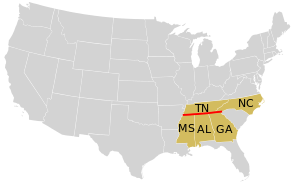 في الولايات المتحدة، يحدد خط العرض هذا الحدود الجنوبية لولاية تنسي، والحدود بين كارولينا الشمالية وجورجيا، بالإضافة إلى النقطة الثلاثية لحدود ولايات أريزونا-كاليفورنيا-نـِڤادا.