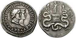 - Sextus' fleet raids the ports of Puteoli and Ostia. The populace hold the Triumvirs responsible for prolonging the war, provoking a riot on the Forum. Octavian, with the Praetorian Guard, goes to intercept the riot, and only escapes with his life because Antony summons troops to rescue his junior colleague.