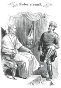 مودس ڤيڤندي، كاريكاتير ڤيلهلم شولتس في Kladderadatsch، العدد 14-15 في 18 مارس 1878 - البابا والمستشار بسمارك، كلاهما يتملق الآخر، بينما العداوة سافرة.