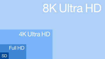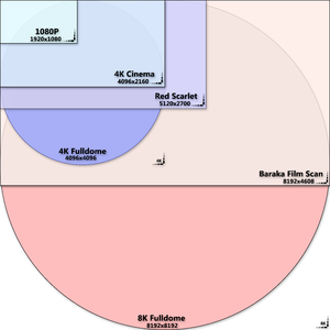 لدقة 8K ضعفي الدقة الأفقية والرأسية لدقة 4K مع أربع أضعاف الپكسل، أو ستة عشر ضعف پكسل الدقة الكاملة.