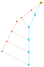 The Sidewinder is not guided by the actual position recorded by the detector, but by the change in position since the last sighting. So if the target remained at 5 degrees left between two rotations of the mirror, the electronics would not output any signal to the control system. Consider a missile fired at right angles to its target; if the missile is flying at the same speed as the target, it should "lead" it by 45 degrees, flying to an impact point far in front of where the target was when it was fired. If the missile is traveling four times the speed of the target, it should follow an angle about 11 degrees in front. In either case, the missile should keep that angle all the way to interception, which means that the angle that the target makes against the detector is constant. It was this constant angle that the Sidewinder attempted to maintain. This "proportional pursuit" system is straightforward to implement and offers high-performance lead calculation almost for free and can respond to changes in the target's flight path,[11] which is much more efficient and makes the missile "lead" the target.[12]