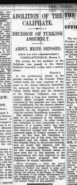 الأخوان الهنديان، مولانا محمد علي ومولانا شوكت علي، زعماء حركة الخلافة بالهند، ووزعت منشورات تدعو الشعب التركي إلى الحفاظ على الخلافة العثمانية من أجل الإسلام. في ظل الحكومة التركيى الوطنية الجديدة، تم تفسير ذلك على أنه تدخلاً أجنبياً، واعتبر أي شكل من أشكال التدخل الأجنبي إهانة للسيادة التركية، والأسوأ من ذلك، أنها بمثابة تهديد لأمن الدولة. وعلى الفور، اغتنم أتاتورك الفرصة. بناءً على مبادرته، ألغى المجلس الوطني الخلافة في 3 مارس 1924. تم إرسال عبد المجيد إلى المنفى مع بقية أعضاء الأسرة العثمانية.