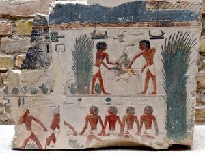 In the covered corridor, on the east and southern edges of the temple, there were carved reliefs along the interior walls.[3] The passageway was decorated with relief scenes depicting the sed-festival, an important Ancient Egyptian ritual of renewal.[4][3] These carvings highlight Re's beneficent attitude towards Nyuserre's reign through episodes of the sed-festival.[2] Such depictions, in fact, represent the most detailed display of this theme from the Old Kingdom.[2] Similar sed-festival scenes also appear in the chapel towards the southern edge of the chapel.[3] Additionally, in the short passageway connecting to the obelisk platform from the south, known as the Room of the Seasons, are detailed painted reliefs in limestone depicting two of the three Egyptian seasons, akhet (inundation) and shemu (harvest).[3] The reliefs from the Room of the Seasons essentially illustrate the sun's life-giving and sustaining role in nature, particularly during the spring and summer seasons.[2] Accompanying these seasonal scenes are illustrations of seasonal activities (i.e. netting fish, trapping birds, making papyrus boats, and phases of the agricultural cycle).[3] The vast illustrations of animal and plant life as well as human engagement with nature may be some of the earliest extensive corpus of such scenes.[2] The artwork was likely commissioned by King Nyuserre himself.[4] Although, the reliefs do not reflect typical royal funerary decoration scene during The Old Kingdom, and although skilfully designed, they are not as carefully executed as similar carvings from the 4th and early 5th dynasties.[2][3] The image to the right shows a fragmented relief from the temple. The carving portrays Egyptians trapping birds in a clap net.[3] The clap net itself is missing, but six men are shown in the lower register holding the rope that will pull the net shut.[3] In the upper right register, two figures are shown caging two birds that have already been caught, while in the upper left corner, a cow and her calf make up the remnants of a much larger animal husbandry scene.[3] Nearly all reliefs at the site were removed, mostly to German collections, and many perished during World War II.[2] Unfortunately as a result, today nearly all reliefs have been either destroyed or severely fragmented.[3]