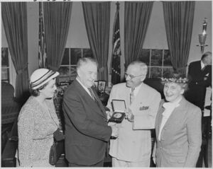 يقدم الرئيس ترومان ميدالية الكونجرس الذهبية لنائب الرئيس باركلي تكريمًا لسنوات خدمته التشريعية.