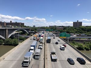 After the George Washington Bridge, which connects Manhattan and New Jersey was completed in 1931, vehicles traveling between New Jersey and The Bronx would travel over the Washington Bridge, which crosses the Harlem River just north of the present Alexander Hamilton Bridge.[6] The Alexander Hamilton Bridge was planned in the mid-1950s to connect Robert Moses' proposed Trans-Manhattan and Cross-Bronx Expressways and to accommodate the additional traffic resulting from the addition of the six-lane lower level to the George Washington Bridge.[5][7] With the Interstate designation, 90% of the $21 million in construction costs were covered by the federal government. The bridge opened on January 15, 1963.[2]
