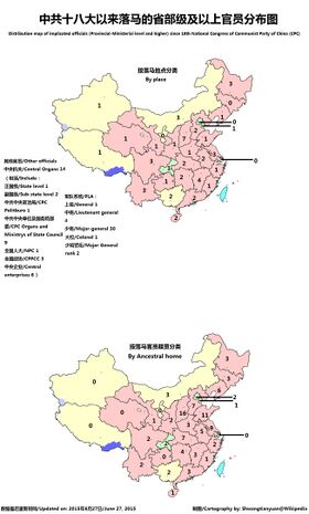 الجدير بالذكر أن العديد ممن تم التحقيق معهم هم رؤساء أحزاب سابقين في عواصم المقاطعات، مما يجعل المنصب "عرضة" بشكل خاص للتحقيق. على سبيل المثال تاييوان (تشن تشوانپينگ، تشن وِيْتشين)، نانجينگ (يو يوانهوي)، جينان (وانگ مين)، گوانگژو (وان تشينگليانگ)، نانجينگ (يانگ وِيْزى)، شينينگ (ماو شياوبينگ)، أورومچي (لي ژي)، لانژو (لو ووتشنگ)، كونمينگ (تشيو خى، ژانگ تيانشين، گاو جينسونگ)، وتشنگدو (لي تشونتشنگ).[بحاجة لمصدر]