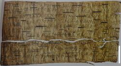 A fragment of a birch bark scroll in Sanskrit, in the Brāhmī script, was part of the British Library Gandhara scroll collection. It is presumed to be from North India, dating to sometime during the first few centuries CE.[6] Birch bark manuscripts in Brāhmī script were discovered in an ancient Buddhist monastery in Jaulian, near Taxila in the Punjab in Pakistan, and dated to the 5th century CE.[7]