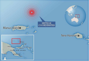 CNEOS 2014-01-08, also known as Interstellar meteor 1 (IM1),[2][3][4] was a 0.45 m (1.5 ft) meteor that impacted Earth on 8 January 2014 near the northeast coast of Papua New Guinea. It was claimed to be an interstellar object in a 2019 preprint by astronomers Amir Siraj and Avi Loeb,[2][5] and this was published in 2022.[6][7][8][9] This was supported by the U.S. Space Command in 2022 based on the object's velocity relative to the Sun.[10][11][12][13][14][15][7] NASA and other astronomers doubt this,[16][17][18][19][20][21] and still other experts found Earth-related explanations for the purported meteorite impact instead.[22]