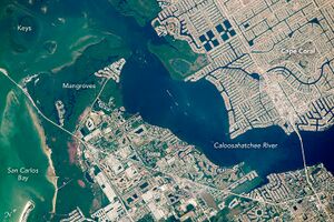 According to the United States Census Bureau, the city has a total area of 120 ميل مربع (310.8 km2), of which 110.09 ميل مربع (285.1 km2) is land and 9.91 ميل مربع (25.7 km2) (9%) is water.[13] Cape Coral is a large peninsula and is bordered in the south and east by the Caloosahatchee River and in the west by Matlacha Pass. Fort Myers lies across the Caloosahatchee River to the east, and Matlacha and Pine Island lie across Matlacha Pass to the west. Matlacha Pass is home to Matlacha Pass National Wildlife Refuge and the Matlacha Pass Aquatic Preserve.[14]