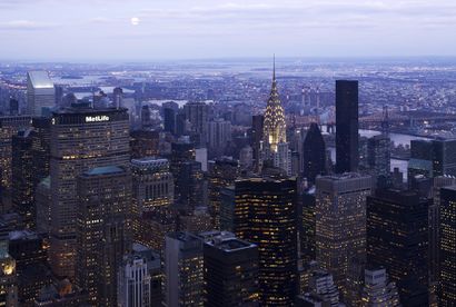 Midtown Manhattan in New York City, the largest central business district in the world. Shown is the terraced crown of the Chrysler Building lit at dawn.