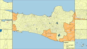 جاوة الوسطى (إندونيسية: Jawa Tengah, جاوية: ꦗꦮꦶ​ꦩꦢꦾ, romanized: Jawi Madya) هي إحدى مقاطعات إندونسيا، وتقع في وسط جزيرة جاوة. وعاصمتها الإدارية هي سماراڠ. It is bordered by West Java in the west, the Indian Ocean and the Special Region of Yogyakarta in the south, East Java in the east, and the Java Sea in the north. It has a total area of 34,337.48 km2, with a population of 36,516,035 at the 2020 Census[7] making it the third-most populous province in both Java and Indonesia after West Java and East Java. The official population estimate in mid-2022 was 37,032,410.[2] The province also includes a number of offshore islands, including the island of Nusakambangan in the south (close to the border of West Java), and the Karimun Jawa Islands in the Java Sea.