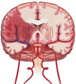 السكتة الدماغية بنقص التروية. «انسداد في أحد الشرايين الدماغية يؤدي إلى احتشاء دماغي».