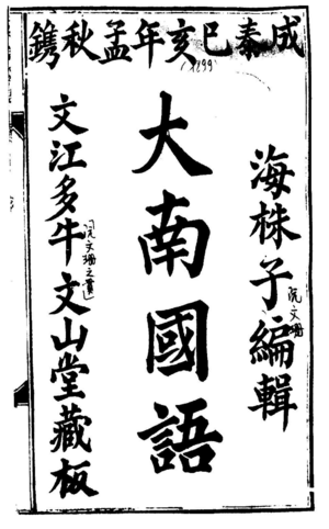Among the earlier works in Nôm of this era are the writings of Nguyễn Trãi (1380–1442).[45] The corpus of Nôm writings grew over time as did more scholarly compilations of the script itself. Trịnh Thị Ngọc Trúc, consort of King Lê Thần Tông, is generally given credit for Chỉ nam ngọc âm giải nghĩa (指南玉音解義; 'guide to Southern Jade sounds: explanations and meanings'), a 24,000-character bilingual Hán-to-Nôm dictionary compiled between the 15th and 18th centuries, most likely in 1641 or 1761.[46][47]