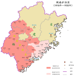 Chen was instrumental in backing Sun Yat-sen's Constitutional Protection Movement. In 1918, Chen led the Guangdong Army and captured southern Fujian. Chen stayed in southern Fujian for two years, during which he devoted himself to building the South Fujian's Constitution-upholding Area[34] with Zhangzhou as its center, and implemented anarchist policies.[1] He also restored Sun to power after the Guangdong-Guangxi War. Chen disagreed with Sun about the direction that reform should take—Sun wanted to unite the country by force and institute change through a centralized government based on a one-party system, while Chen advocated multiparty federalism with Guangdong becoming the model province and the peaceful unification of China. Sun became suspicious that the federalist movement was being exploited by the warlords to justify their military fiefdoms.[بحاجة لمصدر]