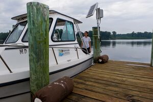 Researchers work in the Chesapeake Bay to collect information about water quality, plant and animal abundances, shoreline erosion, tides, waves, and harmful algal blooms. For example, the Virginia Institute of Marine Science monitors the abundance of submerged aquatic vegetation in the shallow areas of the Chesapeake Bay each summer.[112] Many organizations run continuous monitoring programs. Monitoring programs set out instruments at fixed stations on buoys, moorings, and docks throughout the Bay to record things like temperature, salinity, chlorophyll-a concentration, dissolved oxygen, and turbidity over time.[113][114][115]