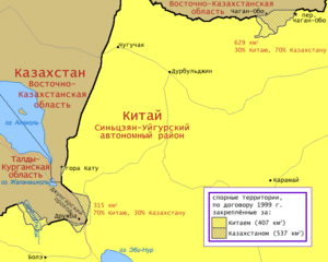 - ^ See the text of the "Agreement between the Republic of Kazakhstan and the People's Republic of China on the Kazakhstan-China international border, signed in Almaty on Aprel 26, 1994" in О ратификации Соглашения между Республикой Казахстан и Китайской Народной Республикой о казахстанско-китайской государственной границе. Указ Президента Республики Казахстан от 15 июня 1995 г. N 2331. The border shown on Google Maps follows the description in the treaty; specifically, border point 38 described in the text is at the border line's crossing with the Terekty River (铁列克提河,Tielieketi he) can be seen at 45°37′00″N 82°15′30″E / 45.61667°N 82.25833°E. The 1969-era Soviet claim in the area can be seen on the period's topo maps, e.g. border point No. 40 on this map.
