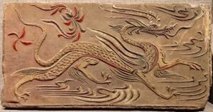 One such early form was the pig dragon. It is a coiled, elongated creature with a head resembling a boar.[25] The character for "dragon" in the earliest Chinese writing has a similar coiled form, as do later jade dragon amulets from the Shang dynasty. A snake-like dragon body painted on red pottery wares was discovered at Taosi (Shanxi) from the second phase of the Longshan Culture, and a dragon-like object coated with approximately 2000 pieces of turquoise and jade was discovered at Erlitou.[2]