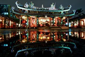 Chinese temples can be found throughout بر الصين الرئيسي وتايوان, and also where Chinese expatriate communities have settled. An old name in English for Chinese traditional temples is "joss house".[1] "Joss" is an Anglicized spelling of deus, the Portuguese word for "god". The term "joss house" was in common use in English in the nineteenth century, for example in North America during frontier times, when joss houses were a common feature of Chinatowns. The name "joss house" describes the environment of worship. Joss sticks, a kind of incense, are burned inside and outside of the temple.