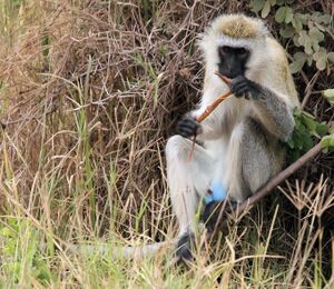 Chlorocebus monkeys are, along with chimpanzees and baboons, the most omnivorous of the primates.[5] They will eat leaves, gum, seeds, nuts, grasses, fungi, fruit, berries, flowers, buds, shoots, invertebrates, bird eggs, birds, lizards, rodents, and other vertebrate prey.[5] Their preferred foods are fruit and flowers, a seasonal resource, varied to cope with changes in food availability.[5] On the island of Saint Kitts, they will commonly steal brightly coloured alcoholic drinks left behind by tourists on the beach.[23] Many tourists have also found out these monkeys will deliver a powerful bite if they are cornered or threatened. In Africa, the documented attacks by these monkeys are extremely rare when compared with dog attacks, in spite of living very closely with humans and often being threatened by humans and their dogs.