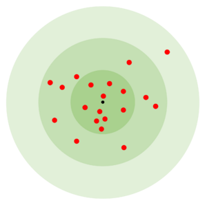 There are associated concepts, such as the DRMS (distance root mean square), which is the square root of the average squared distance error, and R95, which is the radius of the circle where 95% of the values would fall in.