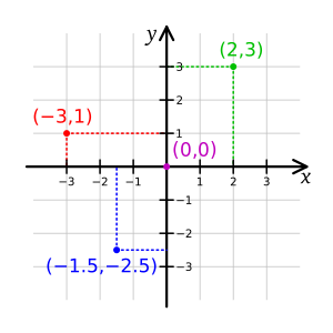 قالب:رئيسية:نظام الإحداثيات الديكارتية في المستوي الثنائي البعد، يتم تمثيل أي نقطة P بزوج من الأرقام (x,y).