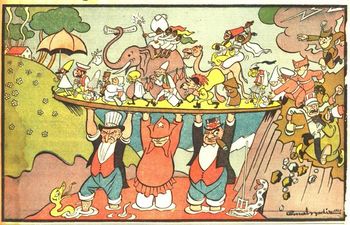 كرتون تركي يصوّر الولايات المتحدة والاتحاد السوڤيتي والمملكة المتحدة يحملون جسراً، فوق برك من الدم تتربص فيها ثعابين النازية، وتمر عليه شعوب العالم الثالث إلى المستقبل. والفيل يمسك بخرطومة وثيقة مكتوب عليها "استقلال". بريشة جمال نادر، يونيو 1945.[1]