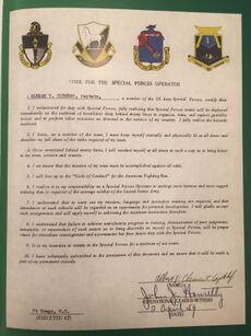 في ڤريتاس، مجلة تاريخ العمليات الخاصة بالجيش، ذكر تشارلز بريسكو أن "SF لم يخطئ في التسمية. دون علم معظم أعضاء مجتمع ARSOF (قوات العمليات الخاصة بالجيش)، اعتمد هذا اللقب من قبل القوات الخاصة في منتصف وأواخر الخمسينيات." ويمضي قائلاً إن جميع المجندين المؤهلين والضباط في القوات الخاصة يجب عليهم "الاشتراك طوعًا في أحكام "قانون مشغلي القوات الخاصة" والتعهد بمبادئه من خلال التوقيع المشهود".[43]