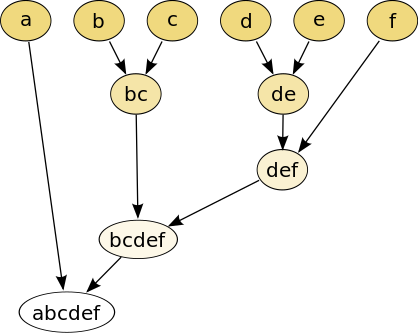 الصف الأعلى من العقد يمثل البيانات (أرصاد فردية)، وباقي العقد تمثل العناقيد التي تنتمي إليها البيانات، والأسهم تمثل المسافات (التباين).