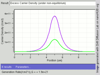 When the density of electrons in solids is not in equilibrium, diffusion of electrons occurs. For example, when a bias is applied to two ends of a chunk of semiconductor, or a light shines on one end (see right figure), electrons diffuse from high density regions (center) to low density regions (two ends), forming a gradient of electron density. This process generates current, referred to as diffusion current.