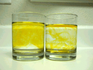 Therefore, some often cited examples of diffusion are wrong: If cologne is sprayed in one place, it can soon be smelled in the entire room, but a simple calculation shows that this can't be due to diffusion. Convective motion persists in the room because of the temperature [inhomogeneity]. If ink is dropped in water, one usually observes an inhomogeneous evolution of the spatial distribution, which clearly indicates convection (caused, in particular, by this dropping).[بحاجة لمصدر]