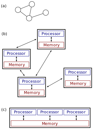 The figure on the right illustrates the difference between distributed and parallel systems. Figure (a) is a schematic view of a typical distributed system; the system is represented as a network topology in which each node is a computer and each line connecting the nodes is a communication link. Figure (b) shows the same distributed system in more detail: each computer has its own local memory, and information can be exchanged only by passing messages from one node to another by using the available communication links. Figure (c) shows a parallel system in which each processor has a direct access to a shared memory.
